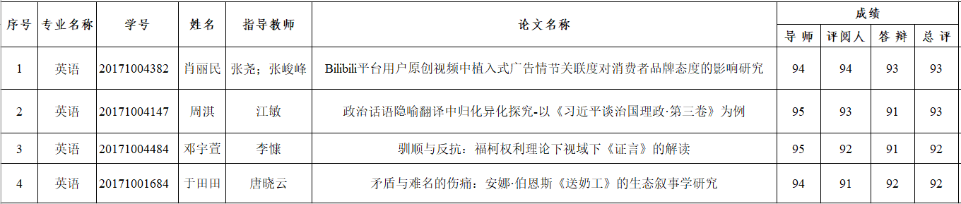 根据我校《本科毕业论文(设计) 工作管理办法》的规定,经答辩委员会审定毕业论文总评成绩,拟推荐 肖丽民、周淇、邓宇萱、于田田 共四位同学的学士学位论文为校级优秀毕业论文,以上推荐名单将报校学位评定委员会审批。