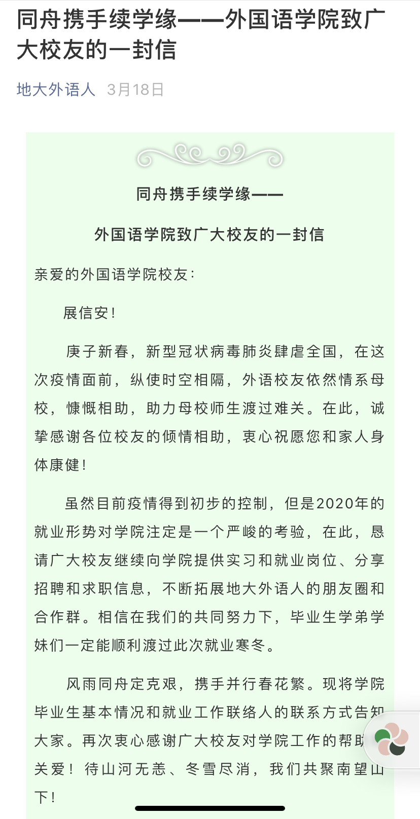 pg娱乐电子游戏官网入口促进2020届毕业生充分就业工作方案 致校友的一封信