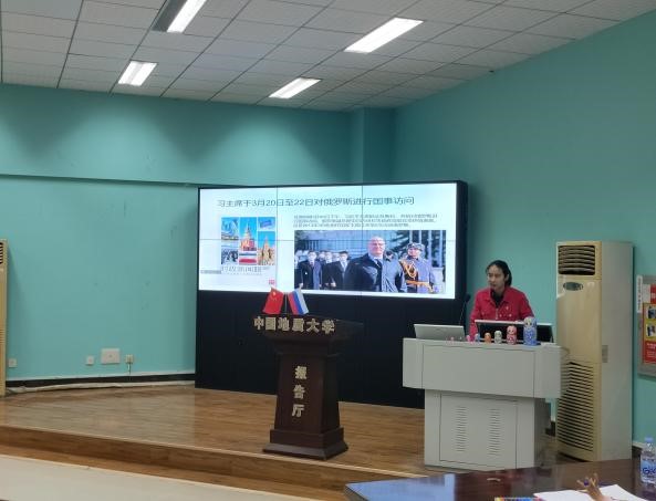 pg娱乐电子游戏官网入口外国语言文学研究生党支部党员代表钟舒琪进行了以《和熊猫一起走近俄罗斯》为题的宣讲,介绍了俄罗斯国情、中俄交往历史、中俄外交成果、中俄熊猫外交趣事等内容,并进行了简单的俄语教学。该同志发挥了作为俄语学生的专业素养,在提前准备宣讲材料的基础上,借助视频、图片、小游戏、特色纪念品发放等途径,为参加活动的师生普及了中俄相关的知识,用“一段介绍视频、一个外交故事、一件特色物品、一句本土名言”为听众生动、形象地展现了中俄“一带一路”建设的过程和成果。活动中,观众们积极参与问答及俄语教学,现场反映热烈。