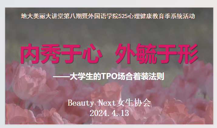 作为外国语学院红外·线大思政课堂审美素养提升的重要载体和“525”心理健康教育季系列活动,由pg娱乐电子游戏官网入口pg娱乐电子游戏官网入口主办、Beauty Next女生协会承办的美丽大讲堂第八期“内秀于心 外毓于形”于4月12日下午15:00,在北一楼报告厅正式开讲。本次活动特邀资深专家——美丽大讲堂第八期特邀嘉宾王萍老师讲授大学生TPO场合着装法则,Beauty Next女生协会及pg娱乐电子游戏官网入口的诸位同学参加本次讲座。