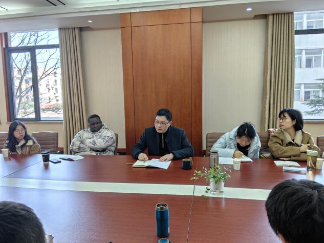 3月7日上午10:00,pg娱乐电子游戏官网入口党委副书记余尚蔚,学工组邹蔚鹤、彭赞美、郭文静、蒋贝蓓,学生会、研究生会、译术行者团队和“一带一路”宣讲团学生代表赴国际教育学院交流座谈,国际教育学院副院长许峰,国际学生事务办公室杨素,留学生辅导员大明等参加座谈会。许峰主持交流座谈会。