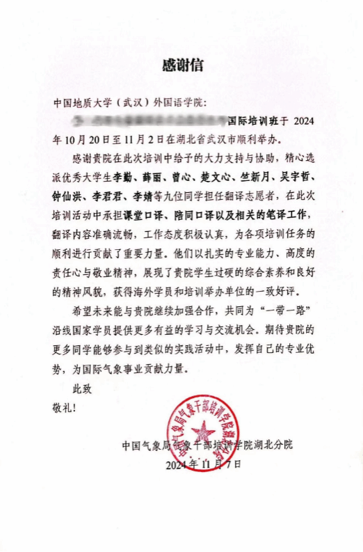 11月7日,中国气象局气象干部培训学院湖北分院给pg娱乐电子游戏官网发来感谢信,以感谢pg娱乐电子游戏官网师生在此次培训活动中给予的大力支持与协助。