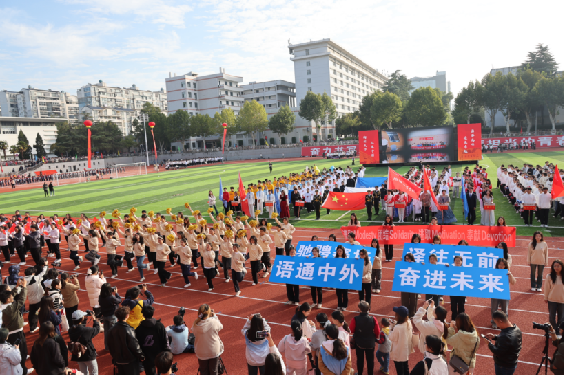 “语通中外,奋进未来,驰骋赛场,‘译’往无前”,pg娱乐电子游戏官网入口师生方阵踏着《运动员进行曲》的鼓点亮相赛场,他们整齐划一,口号嘹亮,表演环节,师生健儿们热情活泼、协同演绎,本科生方阵用青春活泼的舞蹈表演搭配研究生方阵手持展板彰显外语人的“谦和、团结、进取、奉献”的院训精神,让外语人昂扬亮丽的青春风采闪耀赛场。