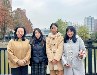 获奖学生王晨熙(左二)、孙一滋(右二)、袁春琳(右一)与指导老师姚夏晶(左一)