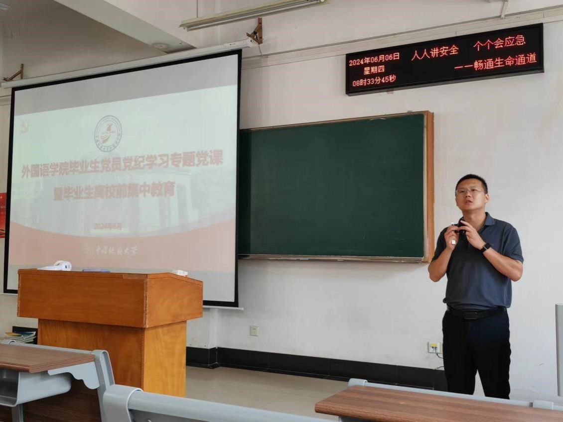 “打铁还需自身硬”。又逢一年毕业季,pg娱乐电子游戏官网入口开展毕业生党员党纪学习集中教育,为毕业生党员系好走向社会的第一粒扣子。党委副书记、纪委书记余尚蔚为全体毕业生党员及全体毕业生讲授党纪学习教育专题党课。
