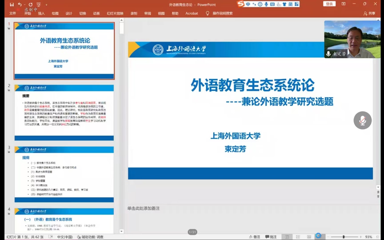 (通讯员 金梓轩 杨红燕)2022年9月22日上午9:30,pg娱乐电子游戏官网入口“南望今声”系列讲座如期举行。上海外国语大学大学博士生导师束定芳教授应邀在线上为pg娱乐电子游戏官网师生做了题为“外语教育生态系统论——兼谈外语教育研究课题”的讲座。讲座由pg娱乐电子游戏官网入口副院长张伶俐教授主持,pg娱乐电子游戏官网师生共140余人参与了学习交流。