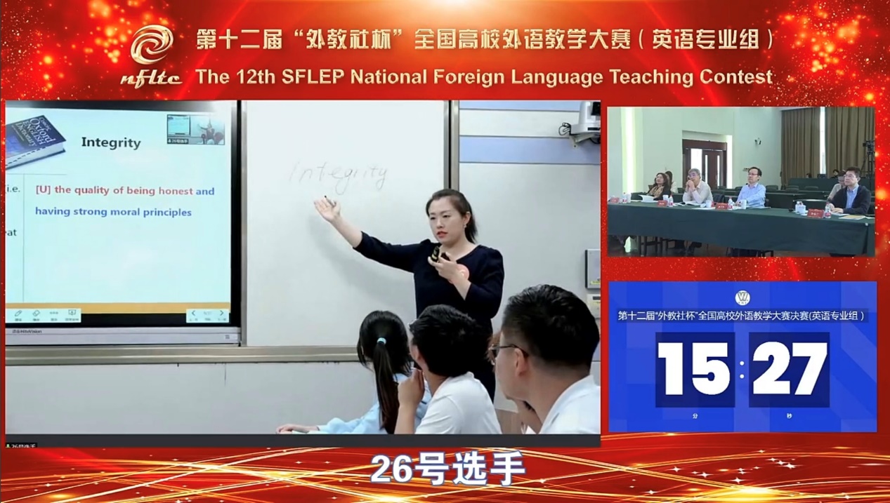 决赛授课展示中,唐慧君老师围绕Honesty and Integrity的主题,引导学生从词义辨析到课文理解,再到基于批判性思维的语言产出,紧扣授课文本的同时又为学生提供了文本学习的新思路和新视角。讲授过程中,唐老师还将思政教育巧妙地融入到知识传授和能力培养中,为大赛评委及全国观众呈现了一堂精彩的综合英语课。