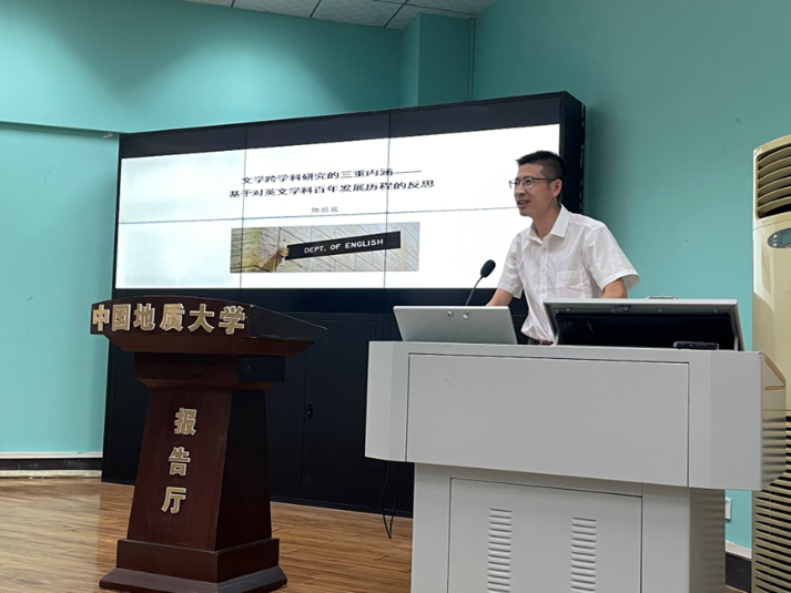 2022年9月22日15时,pg娱乐电子游戏官网入口“南望今声”外语论坛系列讲座第37期在北一楼报告厅举行。华中科技大学pg娱乐电子游戏官网入口教授、外国语言文学研究所主任、博士生导师陈后亮教授应邀来到中国地质大学外语院做题为“文学跨学科研究的三重内涵——基于对英文学科百年发展历程的反思”的讲座。pg娱乐电子游戏官网入口李慷老师主持了讲座,师生共120余人参与学习交流。