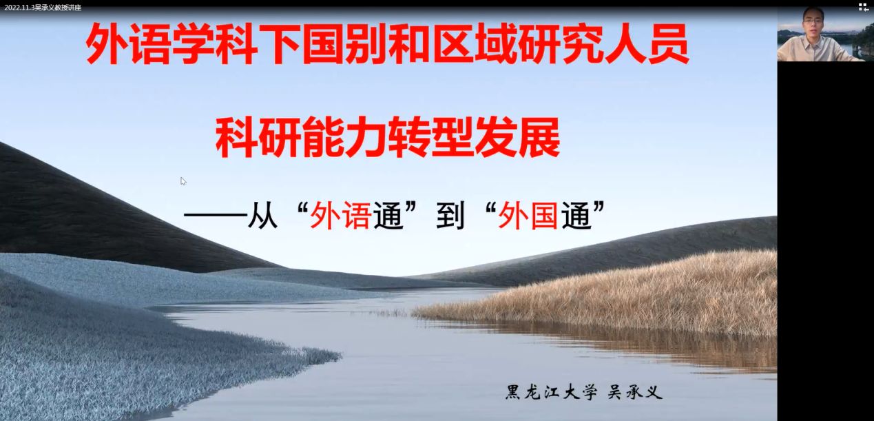 (通讯员 王国念)2022年11月3日下午14时30分,作为校庆70周年系列活动之一的“南望今声”外语论坛第40期在线上如期举行。黑龙江大学吴承义教授应邀为pg娱乐电子游戏官网师生做了题为《外语学科下国别和区域研究人员科研能力转型发展:从“外语通”到“外国通”》的讲座。讲座由我校pg娱乐电子游戏官网入口王国念副教授主持,pg娱乐电子游戏官网入口及其他兄弟高校近200名师生参与学习交流。