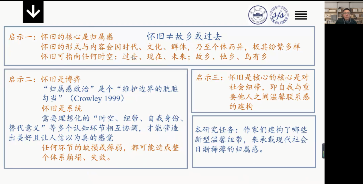 在此基础上,戚教授提出研究目标,即美国式现代怀旧的基本路径和主要模式。传统怀旧的怀旧形式,如“过去的好时光”、“故乡”、“永恒的爱情与友情”等三大经典模式在现代美国已经失去了合法性。因此有必要借助全新的怀旧理论,探讨美国作家们建构了哪些新型温馨纽带,来承载现代社会日渐稀薄的归属感。以此为出发点,戚教授接下来以美国经典文学作品为例,分析了美国文学中现代怀旧共同体的三大经典形式:分离型恋情、漂泊型友情、松散型志趣共同体。。