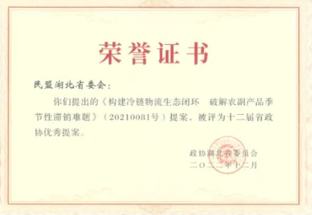 1月8日,省政协第十二届常委会第二十次会议上,对省政协十二届一次会议以来的100件优秀提案进行了表彰,其中民盟省委提交的集体提案中有4件被评为“优秀提案”。由民盟地大副主委、pg娱乐电子游戏官网秦屹副教授执笔撰写的“构建冷链物流生态闭环,破解农副产品季节性滞销难题”提案被评为十二届省政协优秀提案。该提案源于国药控股湖北有限公司副董事长马占军负责的课题、秦屹执笔撰写的调研报告,后作为集体提案在2021年省政协十二届四次会议上由民盟湖北省委提交。